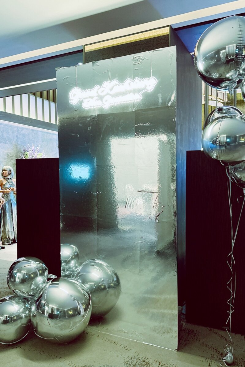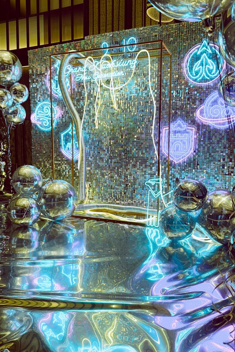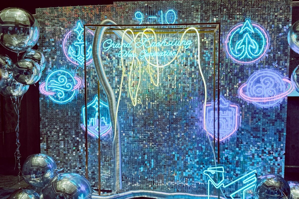 主視覺選用銀色亮片牆與客製霓虹字樣、品牌圖騰燈飾,搭配鏡面金屬氣球與反光地貼,營造如同未來城市般的流光效果;