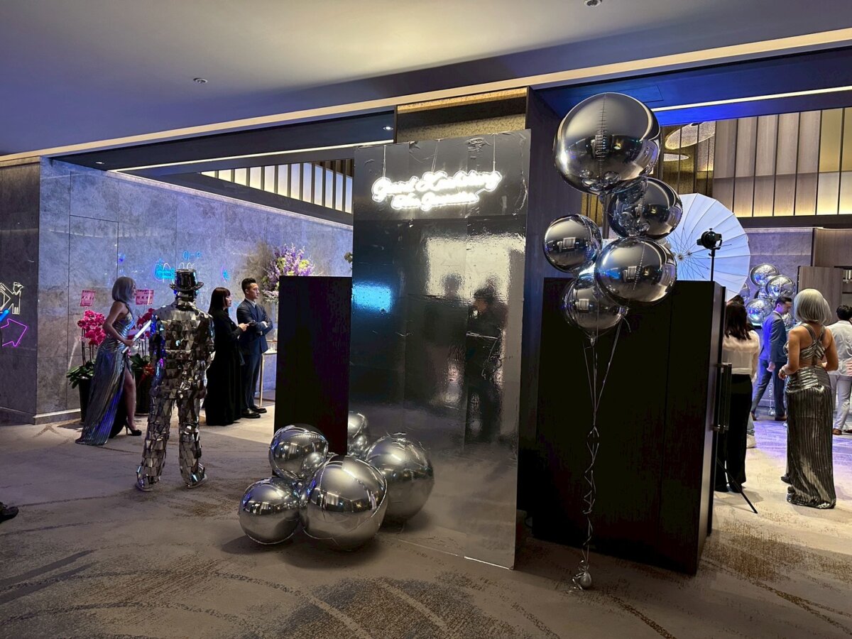 入口處以高亮鏡面裝置作為引導,讓賓客一進場就能聚焦拍照、快速聚人氣氛。