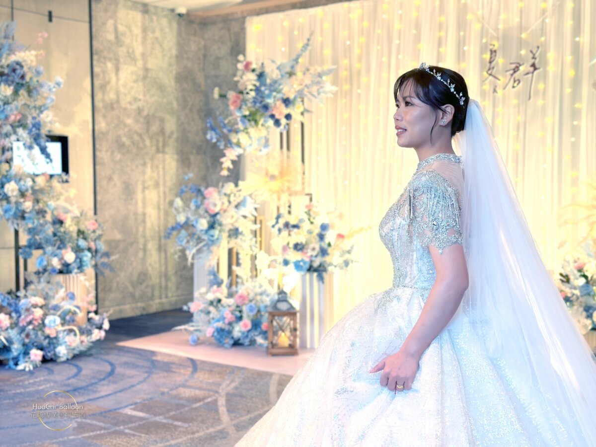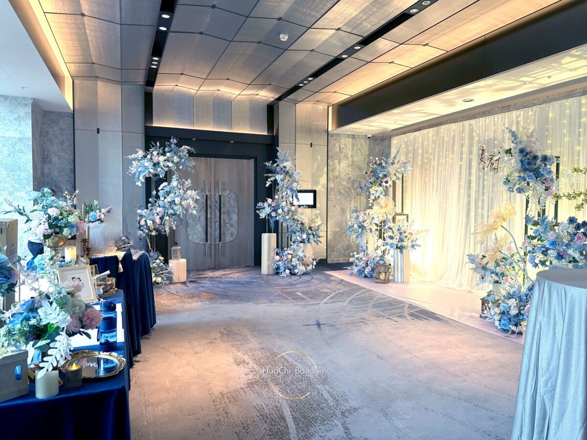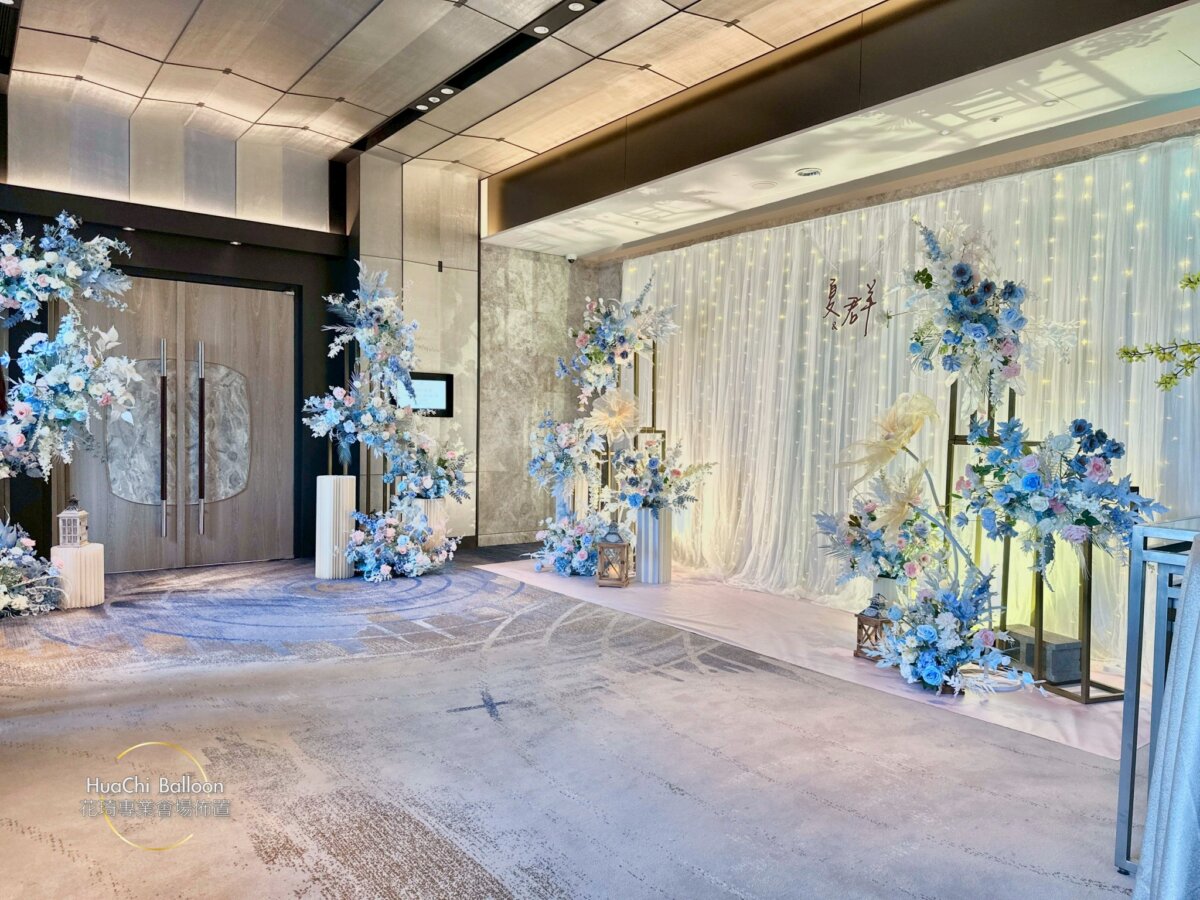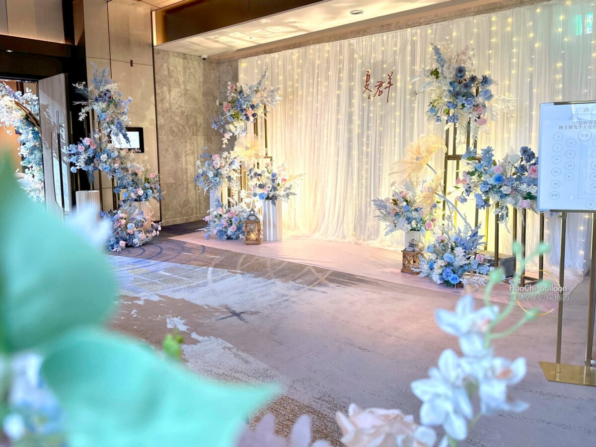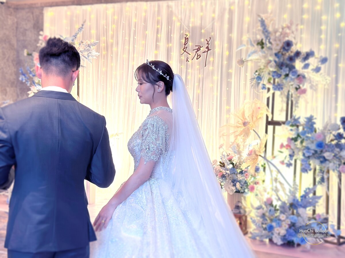 婚禮主場則採用清新藍白系搭配大量光感布幕與層次花藝,入口拱門、迎賓打卡牆與主舞台完美延伸視覺動線,將賓客一步步引入夢幻婚禮現場。
