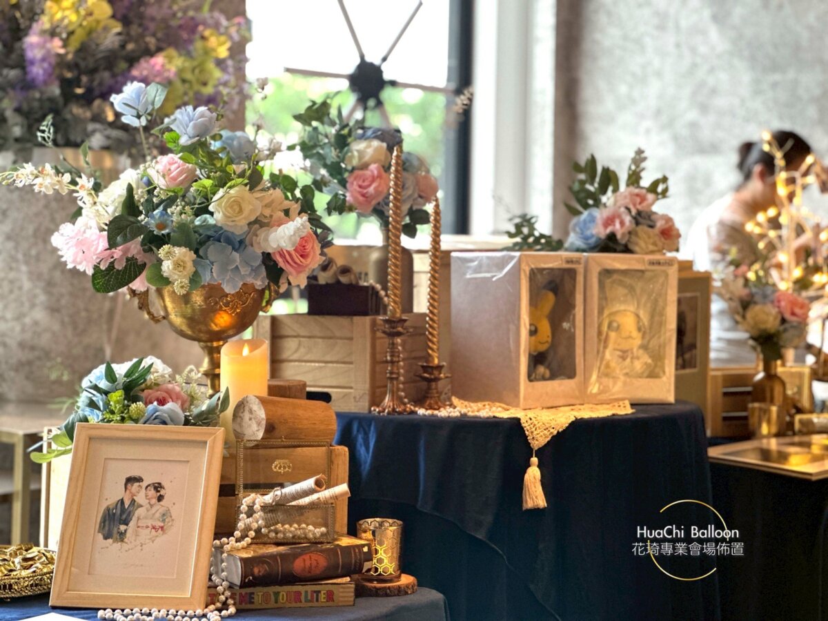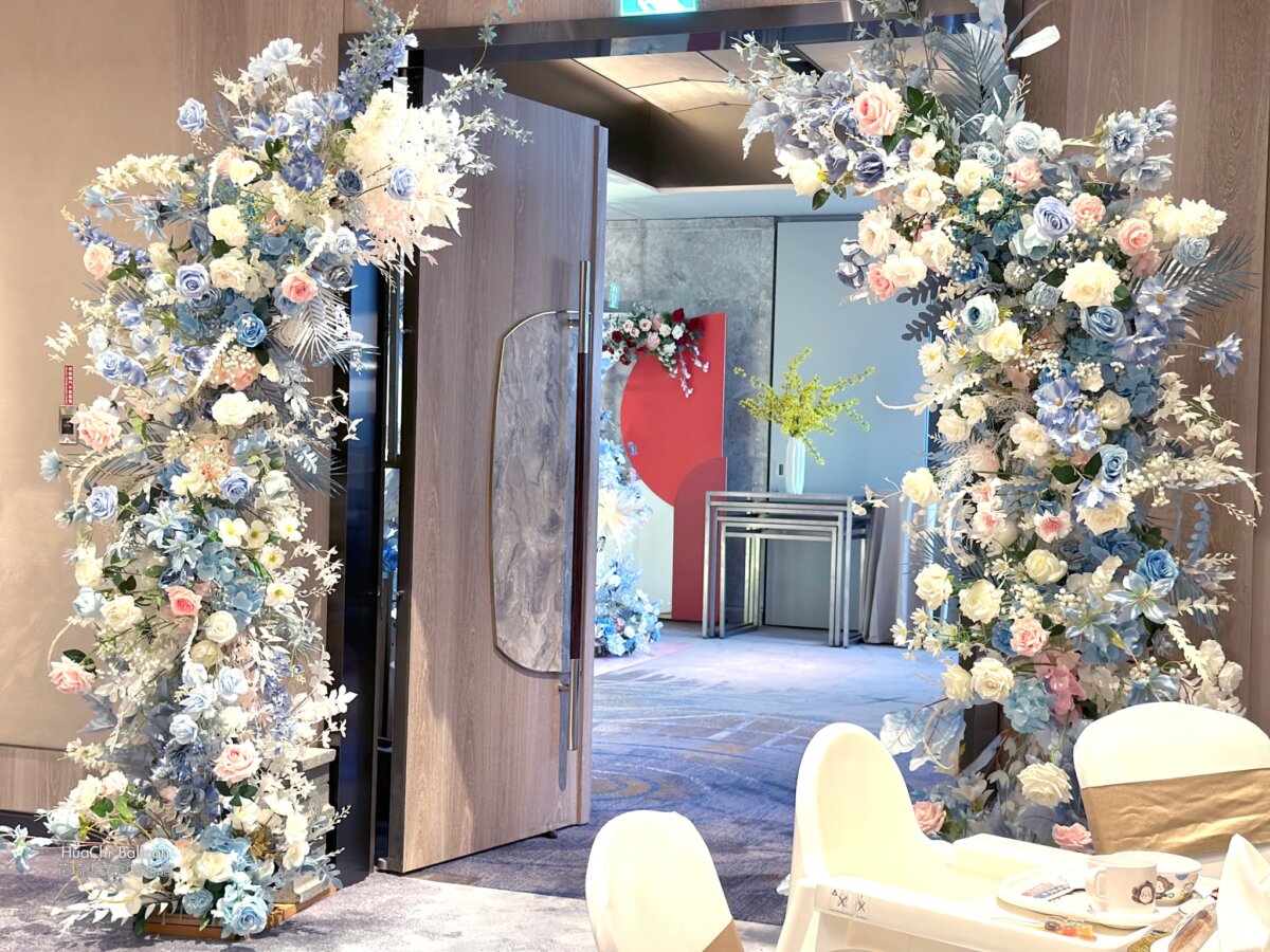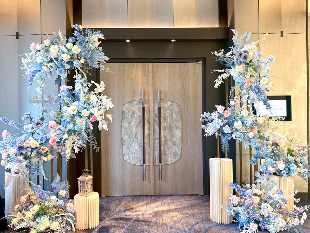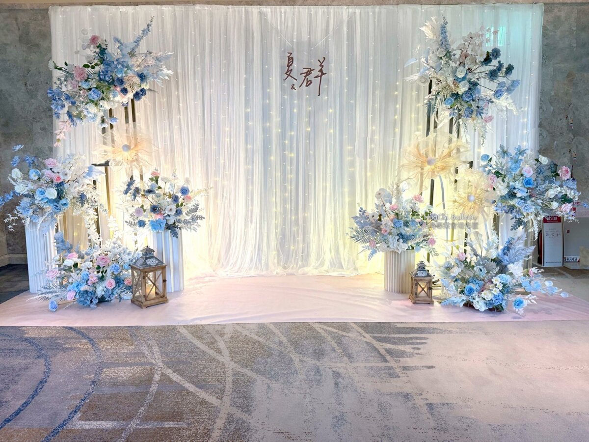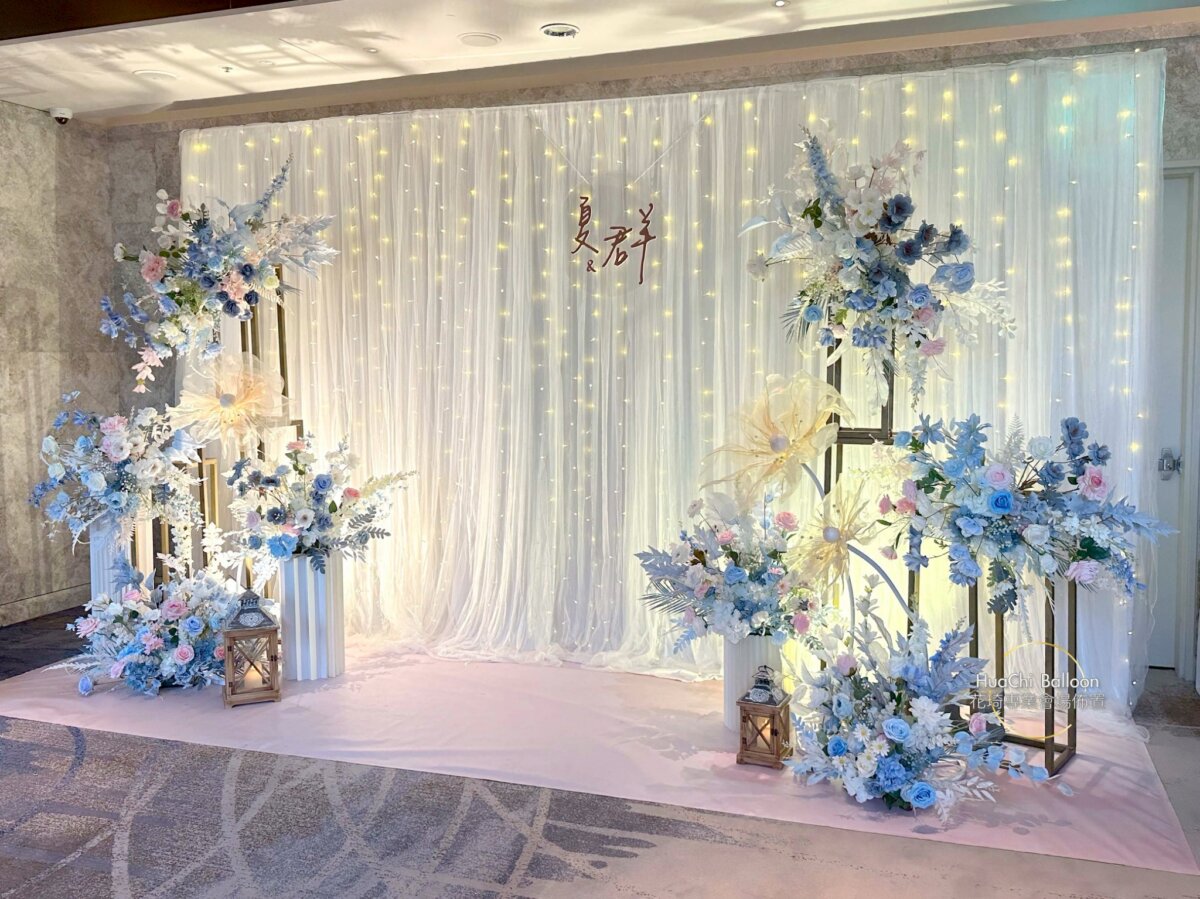 婚禮主場則採用清新藍白系搭配大量光感布幕與層次花藝,入口拱門、迎賓打卡牆與主舞台完美延伸視覺動線,將賓客一步步引入夢幻婚禮現場。