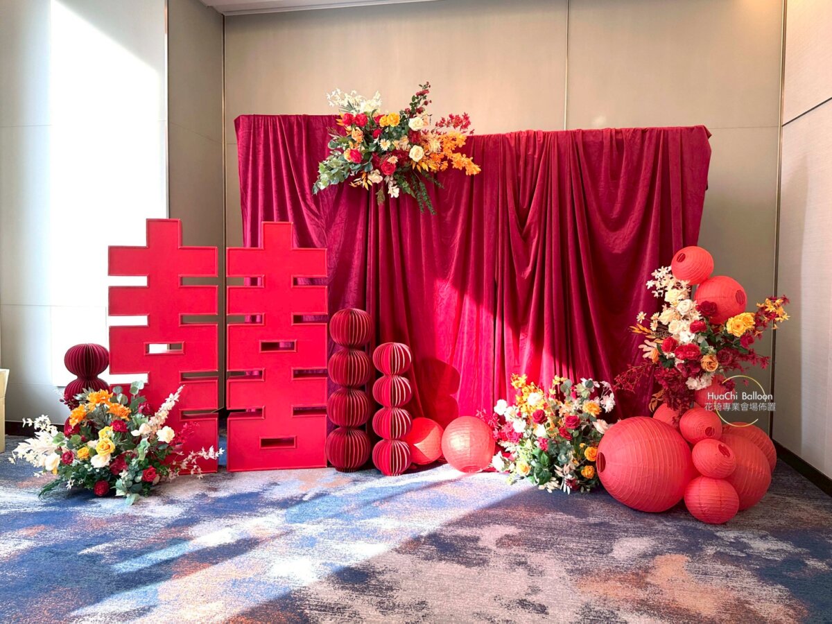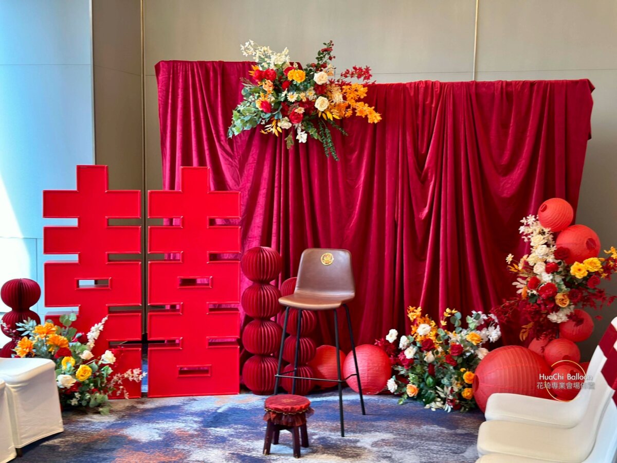 紅色奉茶區選用立體喜字、復古紅球與紅絨背景牆,搭配大膽撞色花藝,呈現熱鬧喜氣又吸睛的迎賓氛圍。