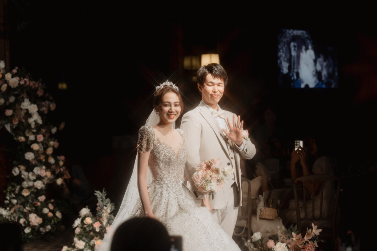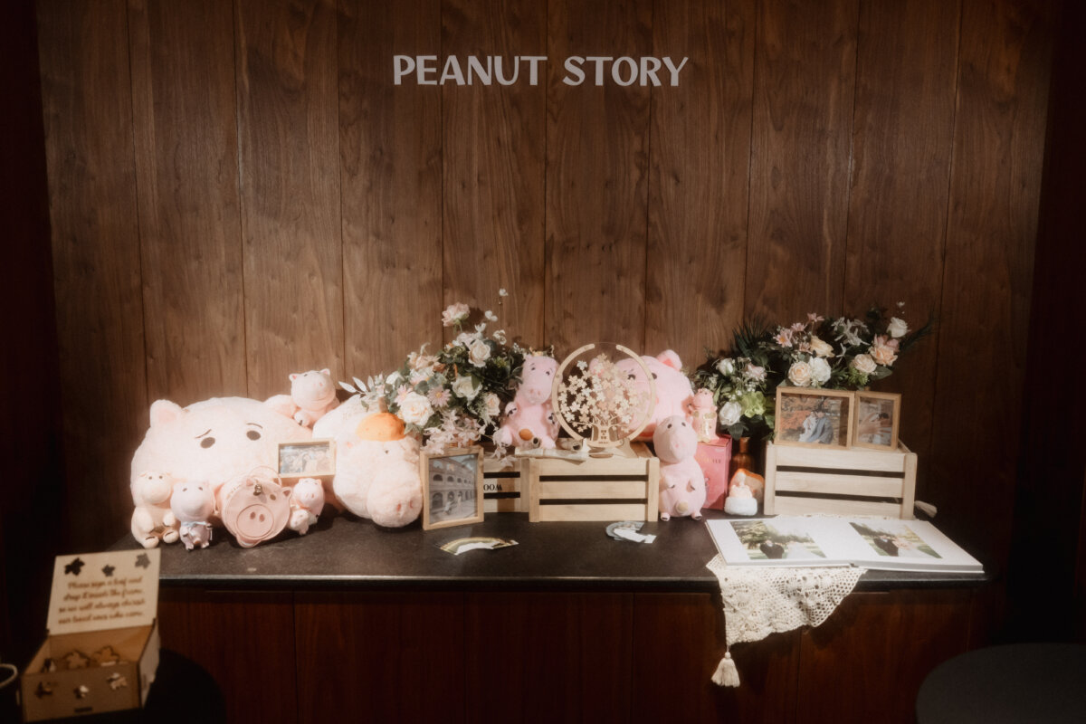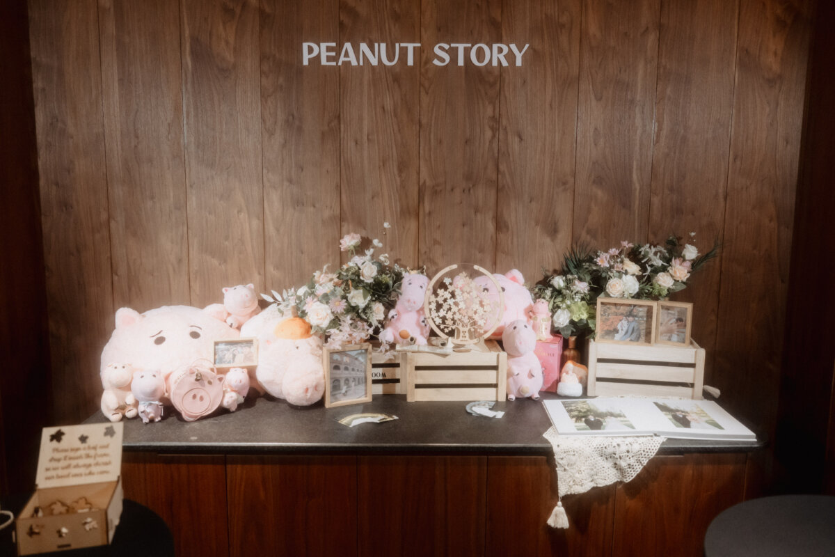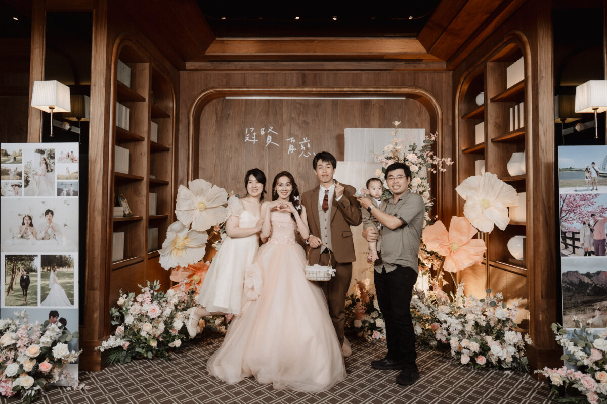 蜜桃粉 × 奶油白 × 香檳金,搭配大型紙花與柔霧燈光,營造如精品展示區般的浪漫氛圍。