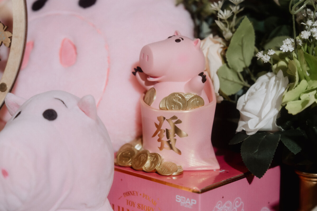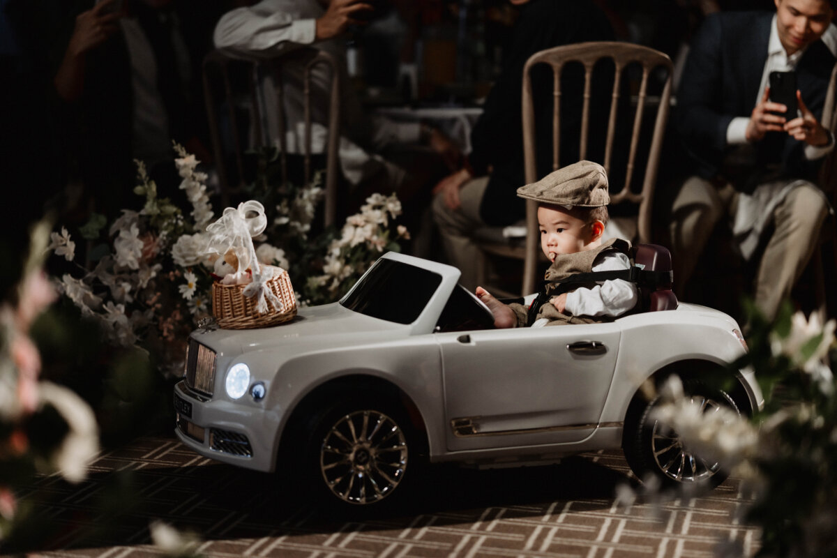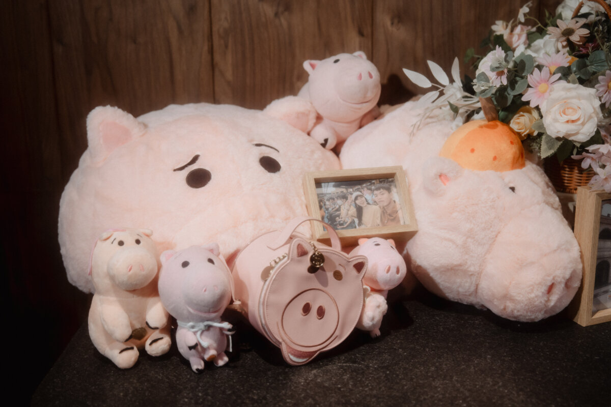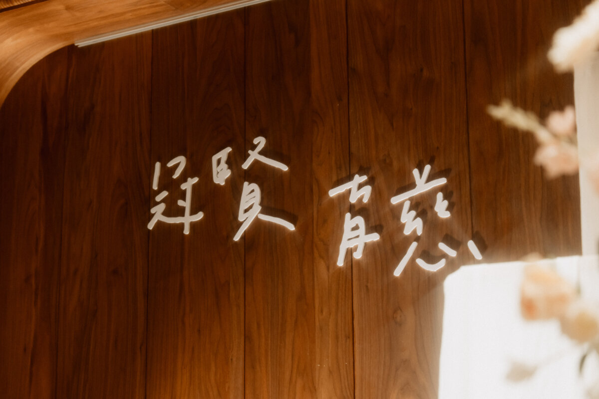 蜜桃粉 × 奶油白 × 香檳金,搭配大型紙花與柔霧燈光,營造如精品展示區般的浪漫氛圍。