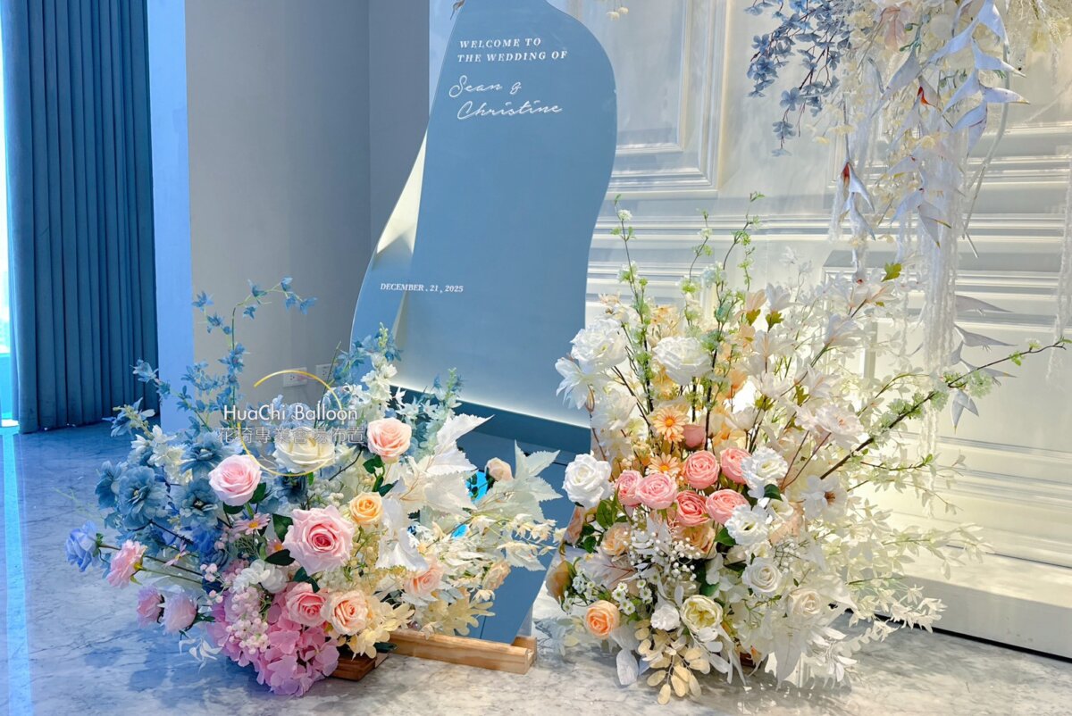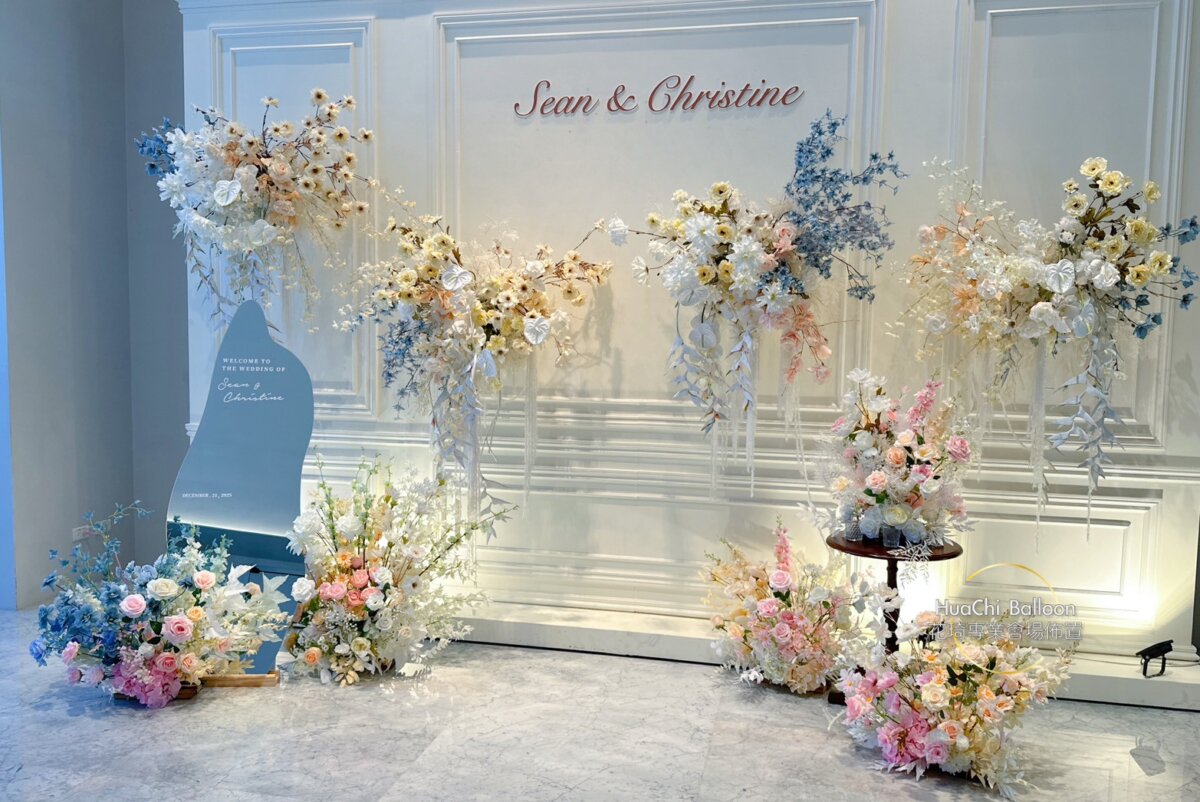 以「溫柔高級感」為主軸,選用奶油白、粉霧裸、淡藍灰等柔和色系花材,