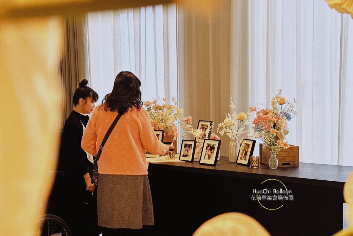 迎賓區同步延伸同款花藝風格,加入相框、桌面小物與照片展示,讓賓客一入場就感受到你們的故事與品味;