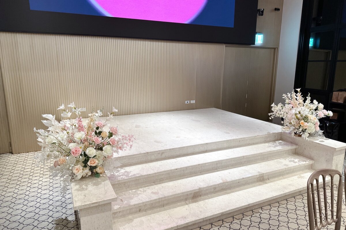 舞台兩側及走道端景也以花藝點綴,完整串起整場視覺一致性。