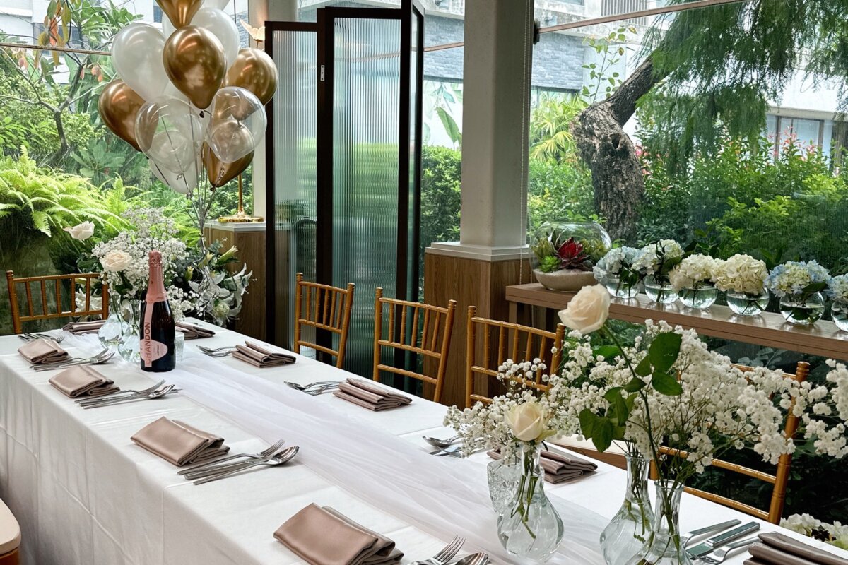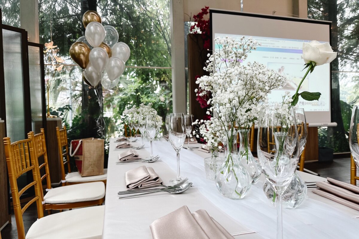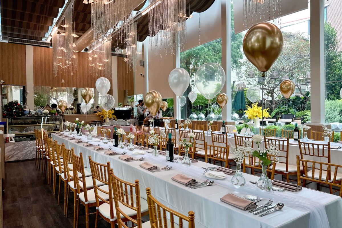餐桌區則以長桌桌花、玻璃花器與氣球點綴,保留空間的通透光感,同時讓視覺細節更有層次;