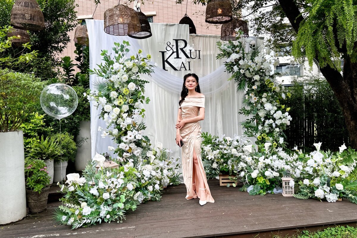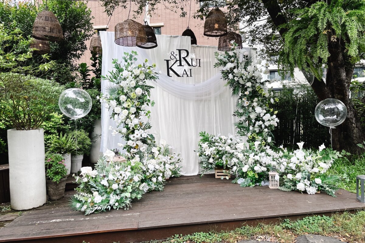 把戶外庭園的綠意延伸成婚禮主題——以白綠花材打造森林系迎賓拍照背板,